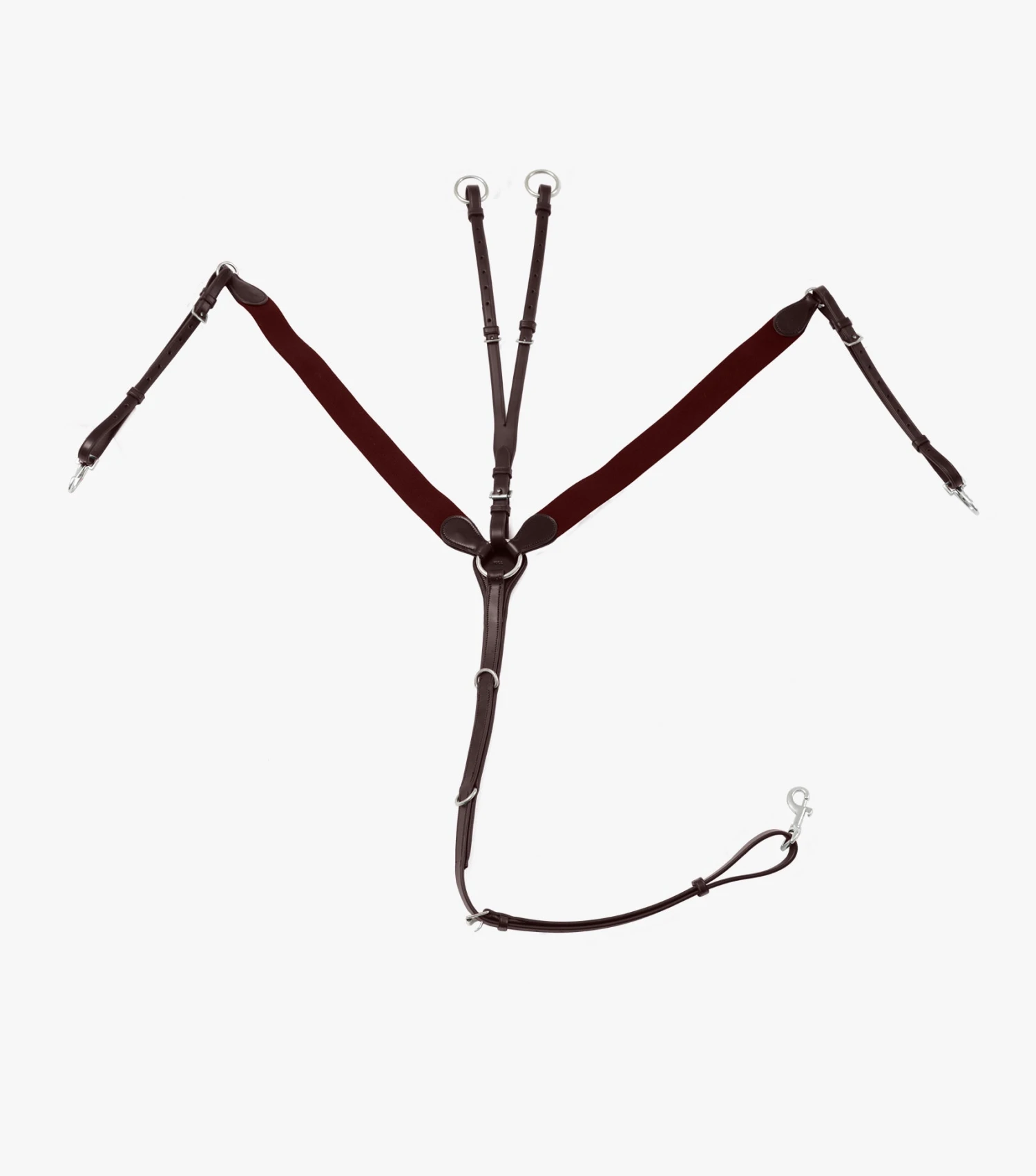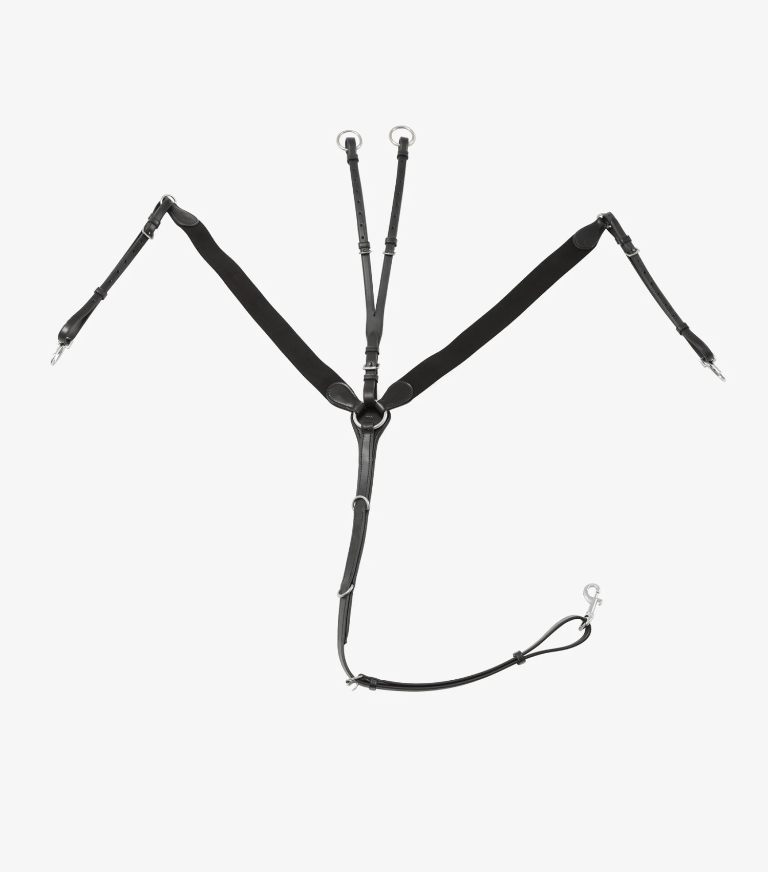 Easily fitted and adjustable at both the D-rings on the saddle and the girth so that you can optimise the fit to suit your horse’s individual needs. A removable running martingale piece enables the breastplate to be used as an aid for keeping your horses head at a controllable height. Two D-rings have been stitched on to the chest strap so that the martingale piece can be lowered or training aids can be attached. Complete with premium quality stainless steel buckles, clips and fixtures this breastplate is perfect for everyday use or competitions.
