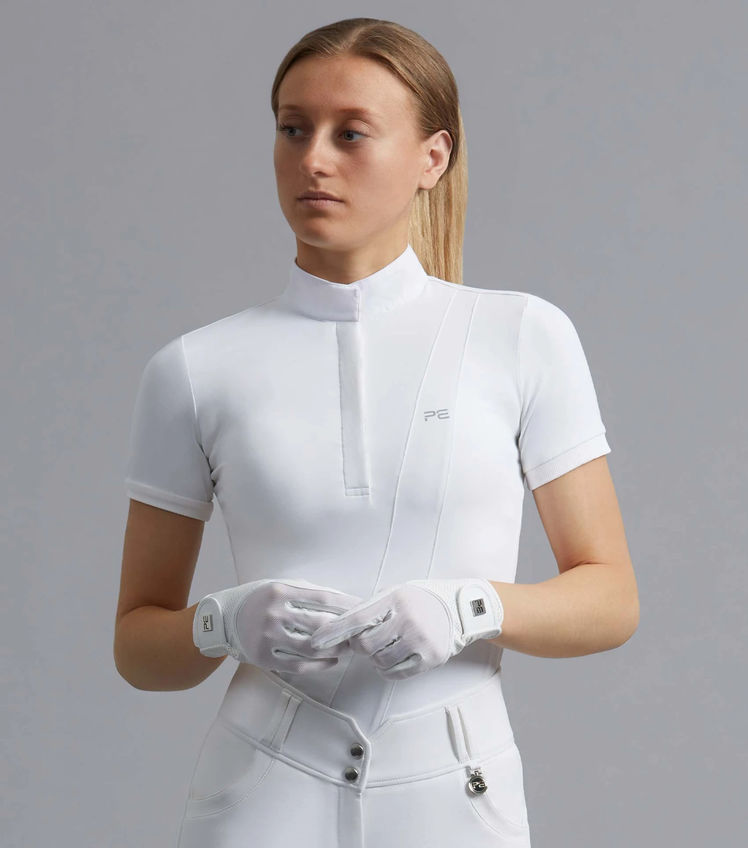 The shirt features a discreet button stand and snap closure on the flawless cotton collar, exuding a sophisticated and professional look. The design incorporates split across-body panels, contributing to a sporty aesthetic that is ideal for showjumping or dressage competitions.