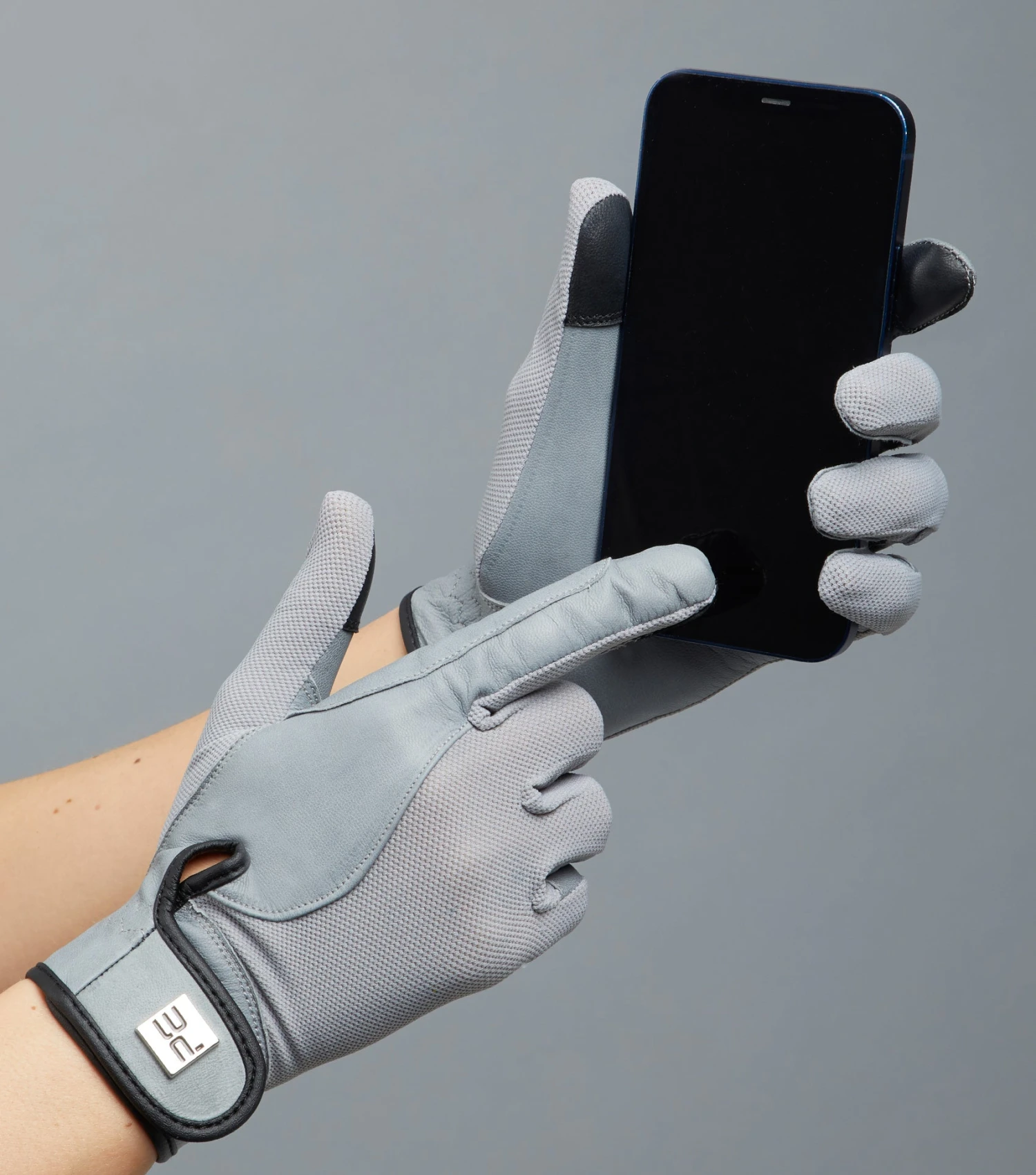 The palm of the glove is made from smooth grained leather, providing optimum grip on the reins. The leather reinforcement encases the index finger for added durability and sleek styling. A touch screen panel on the index finger and thumb allows for use of your phone without removing your gloves. Complete with Velcro closure and an elegant PE branded badge, these leather riding gloves are perfect for everyday equestrian activities and competition use.Â