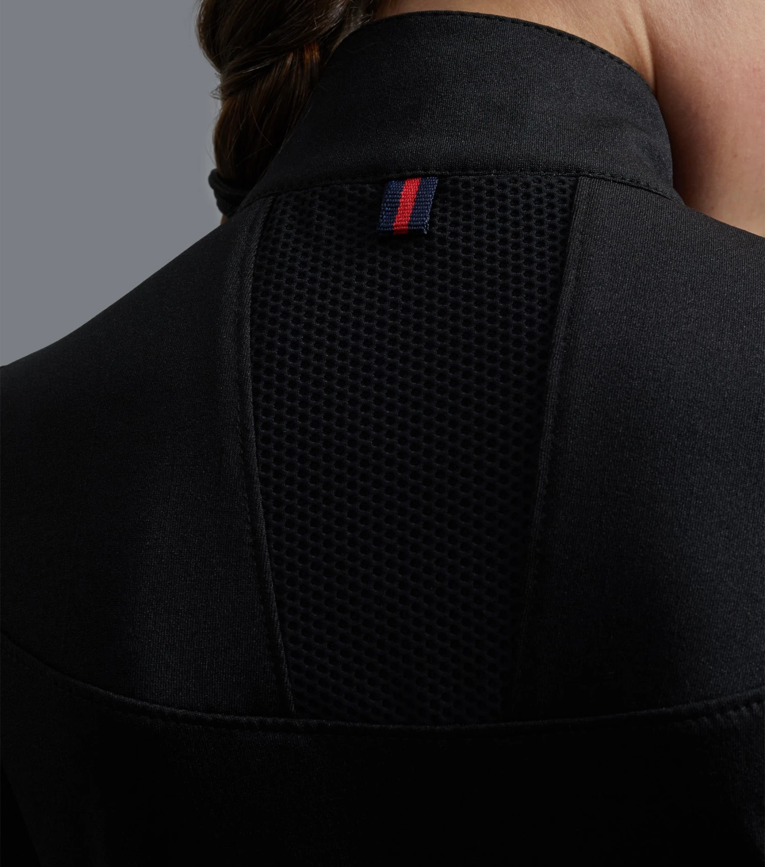 To compliment the mesh sports panels, pleated fabric features over the sleeve edge add a layered dimension. A 1/4 YKK zip accents the standard height collar and flattering seam lines created a panelled look to enhance the silhouette.