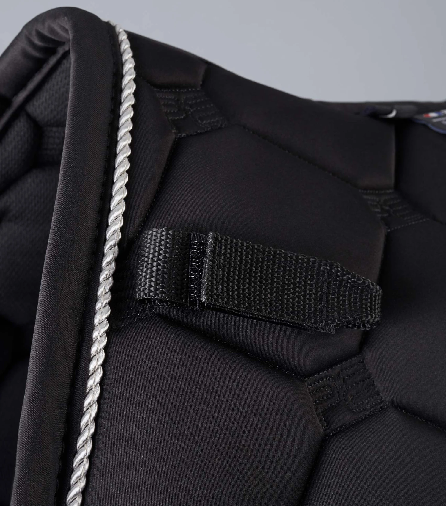 Complete with decorative twisted ropes which accent the outer edge of the saddle square, adding a touch of embellishment. Adjustable Velcro D loop straps and Velcro girth straps allow you to secure your saddle. One of the best close contact GP / Jump squares for those who want to make a statement in the equestrian field.Â