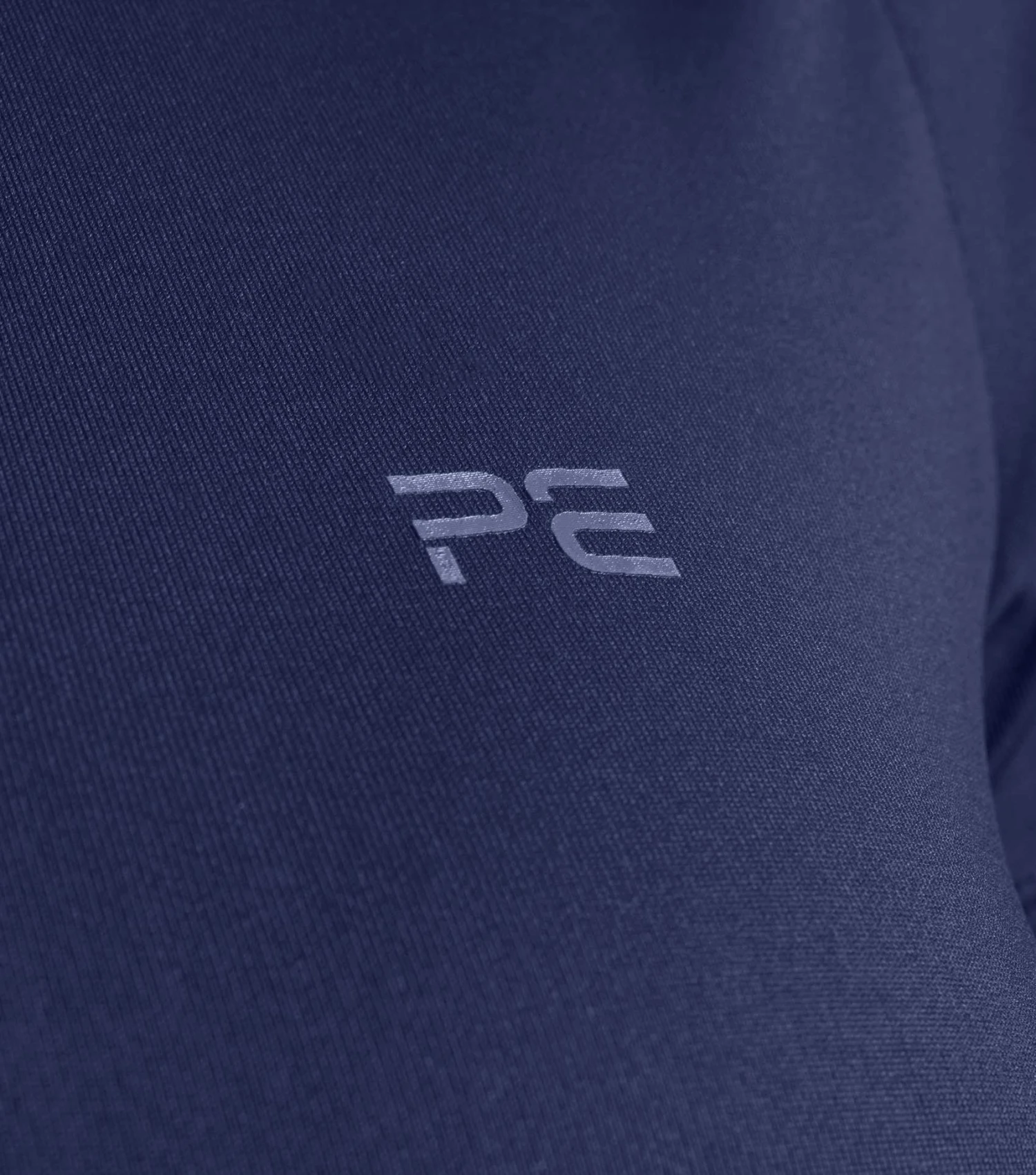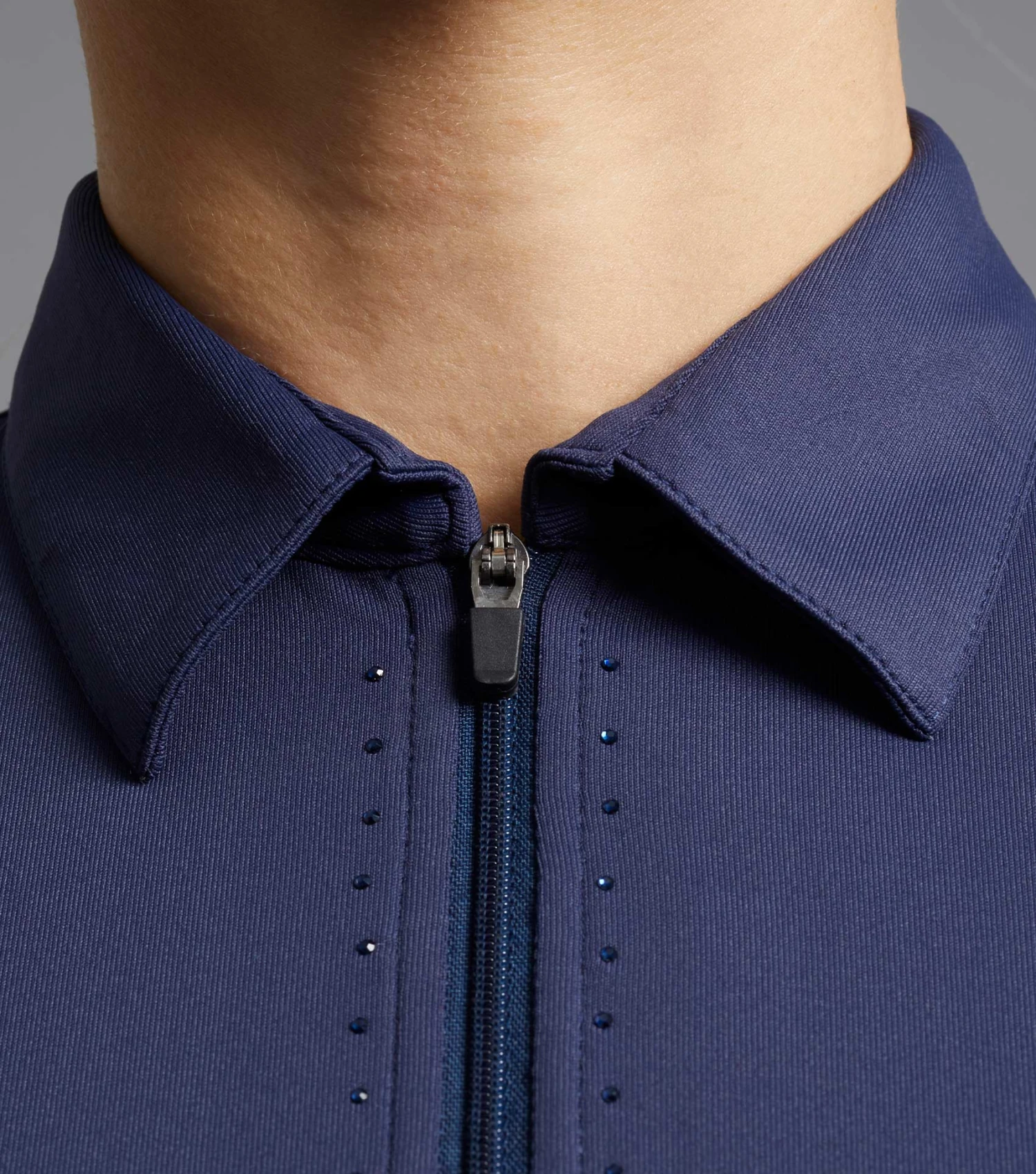 This highly breathable short-sleeved riding top is constructed from a hybrid material, offering soft-touch comfort and moisture wicking properties. A ¹/₄ zip allows for easy closure without the need for delicate buttons. Featuring a sophisticated shirt collar and subtle tonal gemstone embellishment which surrounds the zip closure.